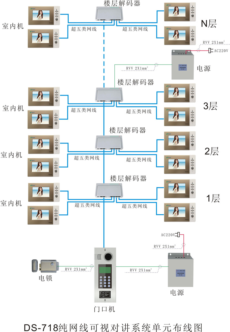 • DS-718網線可視對講系統聯網布線圖