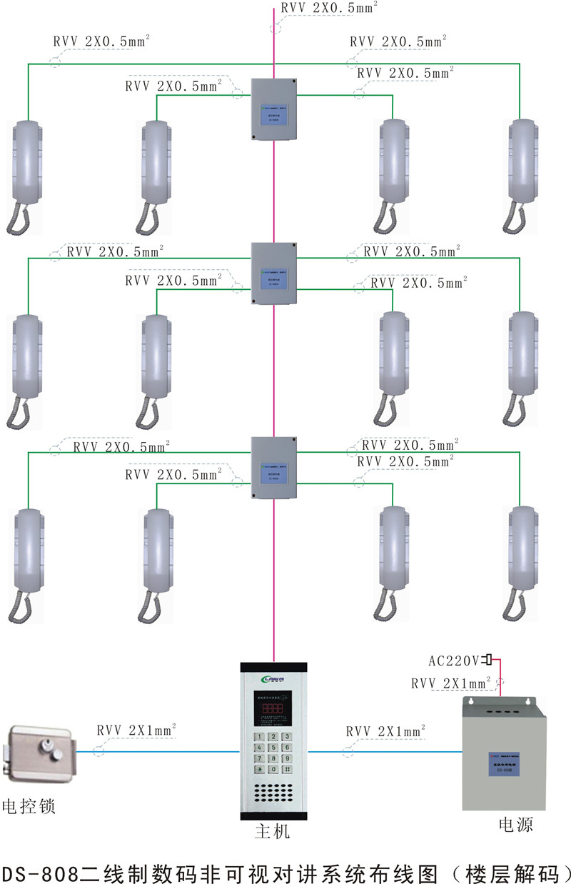 • DS-808二線制數碼非可視對講系統布線圖(樓層解碼)